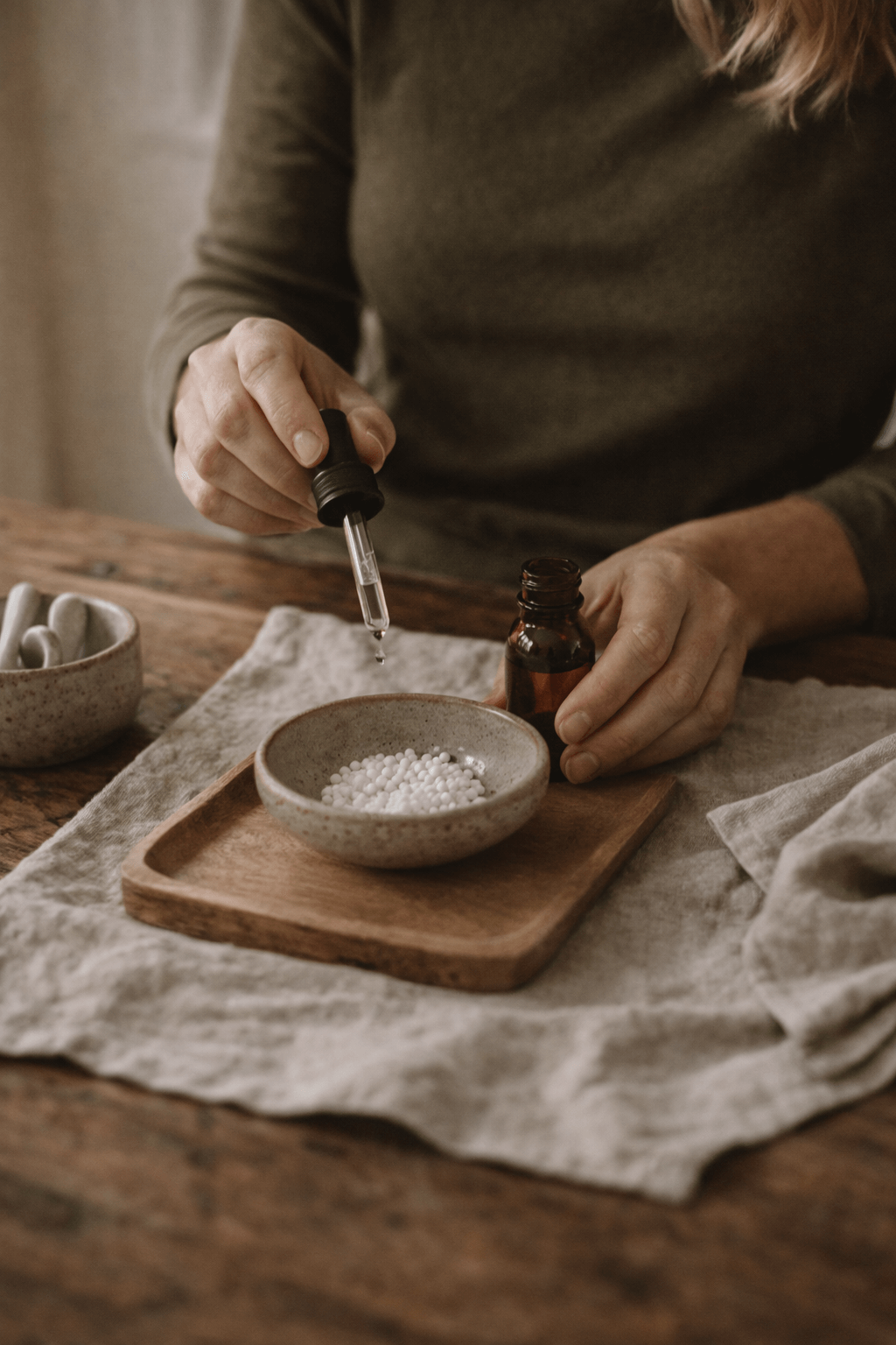 Homeopathy is a complete system of natural medicine that works by stimulating the body’s own healing intelligence. Remedies are made from plants, minerals, or other natural substances and are prepared through a unique process of dilution and succussion (vigorous shaking), transforming them into energetic rather than chemical medicine.